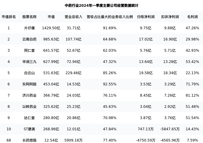 长药控股最新报告期数据为一季度,下表汇总了中药行业内市值靠前的公司一季度主要经营数据