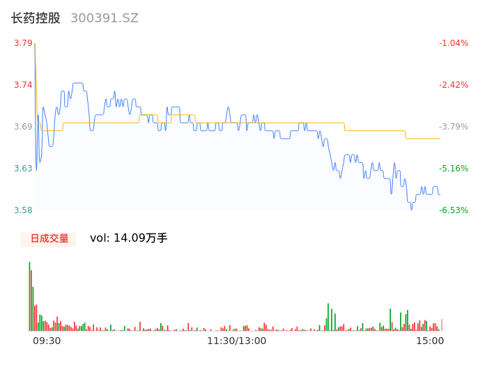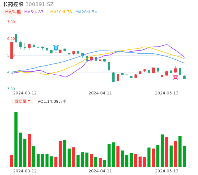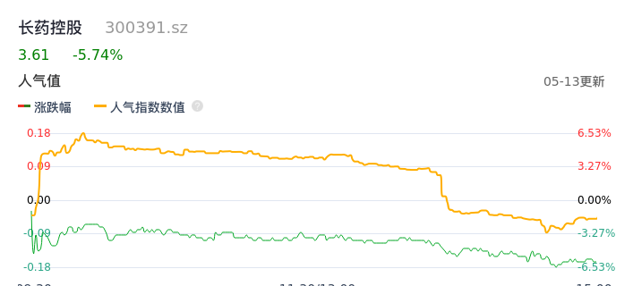 05月13日,长药控股收报3.61,股价涨幅-5.74%,成交金额5165.62万元,换手率4.02%。