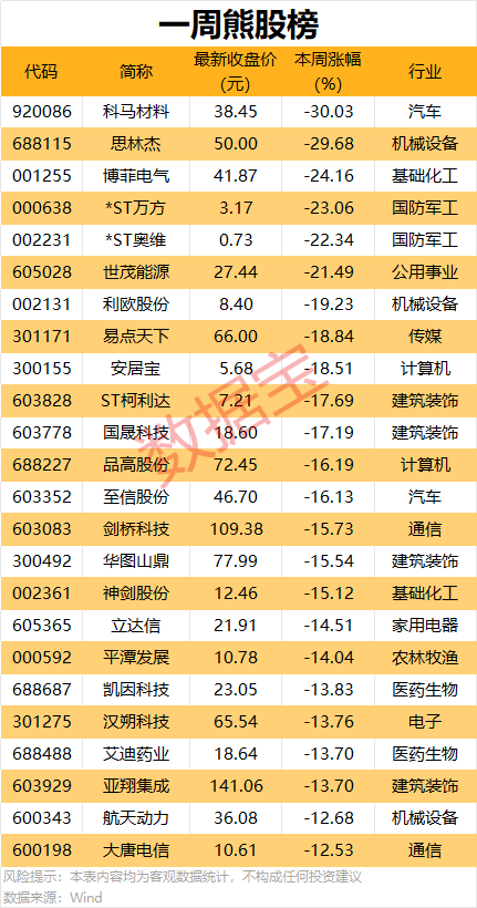本周累计下跌的个股中,46股跌幅均在10%以上,科马材料累计跌超30%,思林杰、博菲电气跌幅均在24%以上。