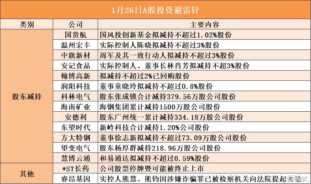 国货航股东国风投创新基金拟减持不超过1.02%股份;温州宏丰实际控制人陈晓拟减持不超过3%股份;中旗新材股东周军及其一致行动人拟减持不超过3%股份;安记食品实际控制人、董事长林肖芳拟减持不超3%股份;翰博高新拟减持不超过2%已回购股份;润阳科技董事童晓玲拟减持不超过0.8%股份;科林电气股东张成锁合计减持379.56万股公司股份;安德利股东广州统一累计减持334.18万股公司股份;方大特钢董事徐志新拟减持不超过73.09万股公司股份;望变电气股东杨厚群减持218.96万股公司股份;*ST长药公司股票停牌暨可能被终止上市;睿昂基因实控人熊慧、熊钧因涉嫌诈骗罪已被检察机关向法院提起诉讼