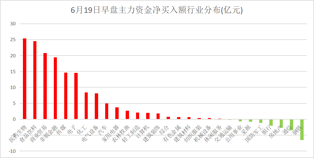 从行业分布来看,28个申万一级行业中,20个行业早盘获主力资金增持。其中,医药生物、食品饮料、商业贸易行业主力净流入额居前,分别为25.42亿元、24.53亿元、20.79亿元;非银金融、传媒、电子行业主力净流入额也均超过10亿元,分别为19.41亿元、14.67亿元、14.55亿元。