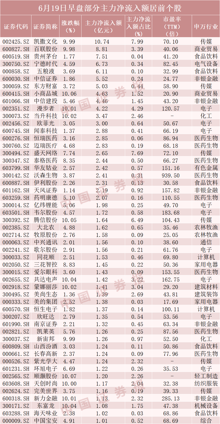 具体来看,凯撒文化、百联股份、贵州茅台早盘主力净流入额居前,分别为10.74亿元、8.81亿元、7.51亿元;宁德时代、五粮液、中信证券、东方财富主力净流入额分别为6.73亿元、6.11亿元、5.52亿元、5.03亿元,小商品城、中信建投、漫步者主力净流入额也均在4亿元以上。