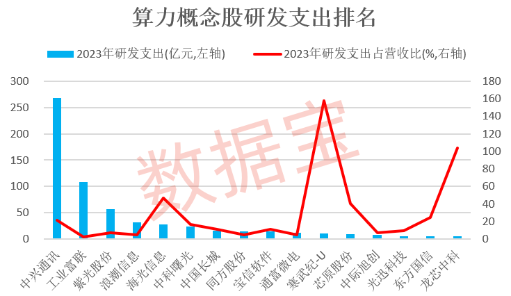 据证券时报·数据宝统计,A股算力概念股2023年研发支出合计达到673.34亿元,占营收的比例为7.12%,这一比例是A股同期水平的2.84倍。11只概念股研发支出超10亿元,包括中兴通讯、工业富联、紫光股份、浪潮信息、海光信息等。