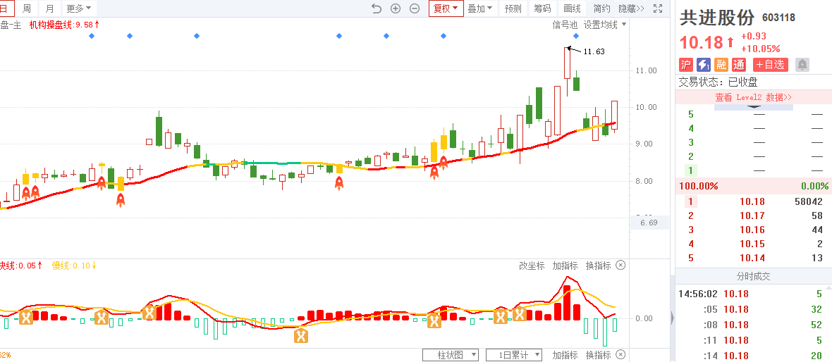 1)共进股份-四维操盘-近期出现火箭信号且底部量柱由绿转红