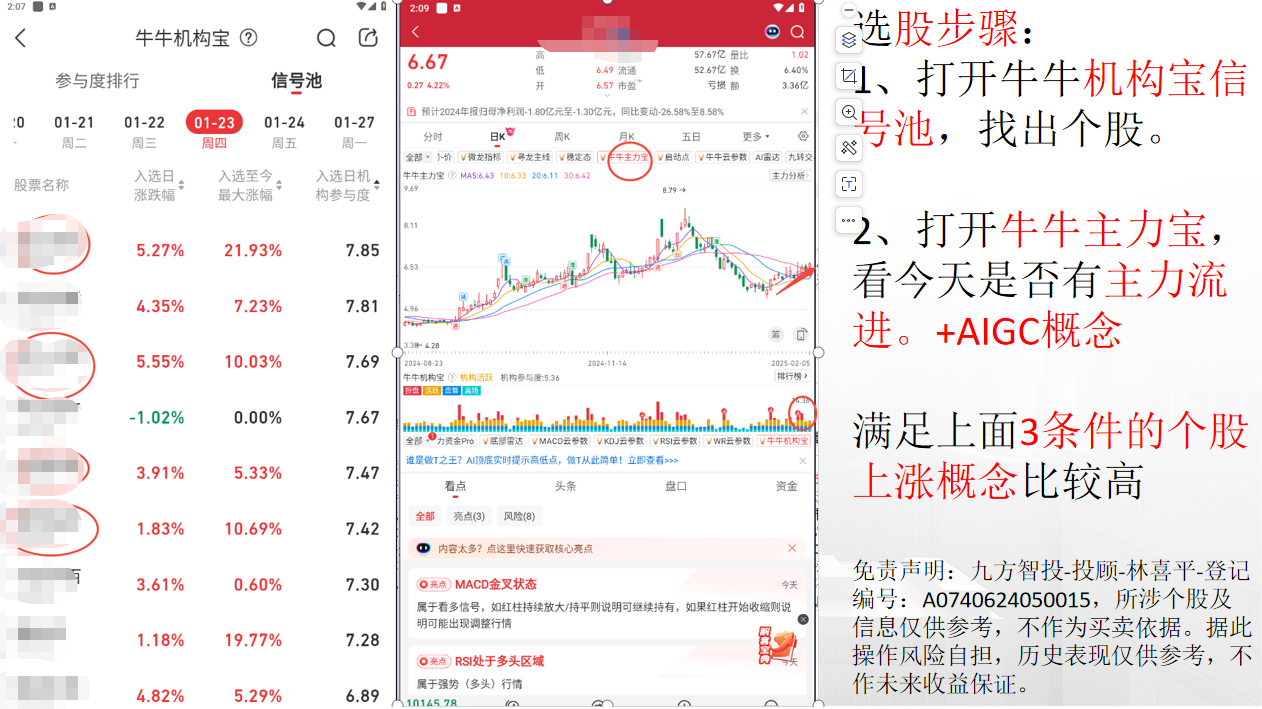 2、智胜套装—“牛牛信号池”可以找到,日内机构买入排名靠前的投资品种,且个股都是有反转信号。(题材上——AIGC);