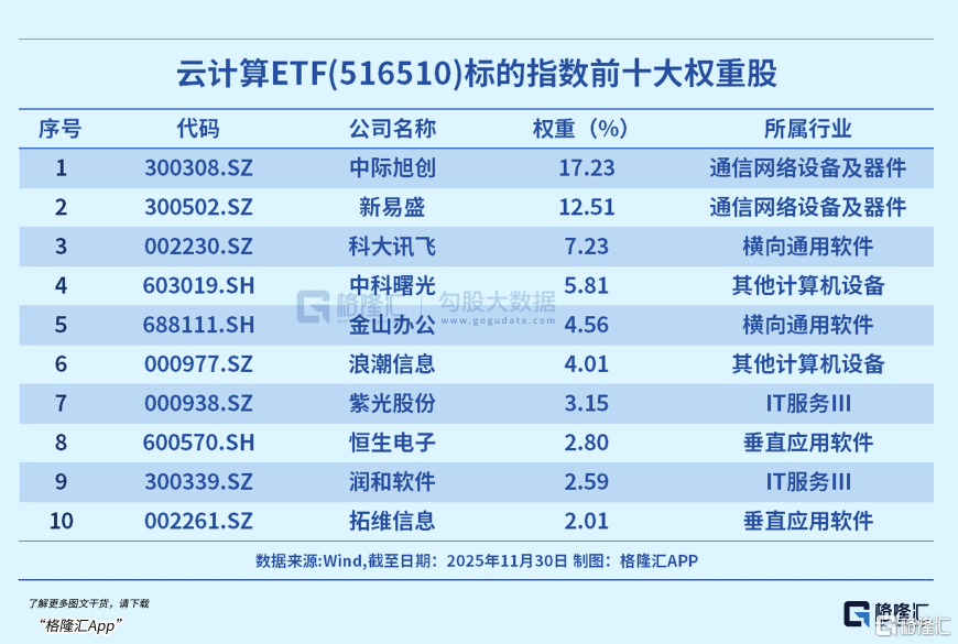 又如云计算ETF(516510),跟踪中证云计算与大数据主题指数,标的指数囊括AI上游基建、中游模型、下游应用,前十大成份股覆盖光模块龙头中际旭创、新易盛;电子终端及组件龙头中科曙光、浪潮信息;软件开发龙头科大讯飞、金山办公;IT服务紫光股份、润和软件等公司。