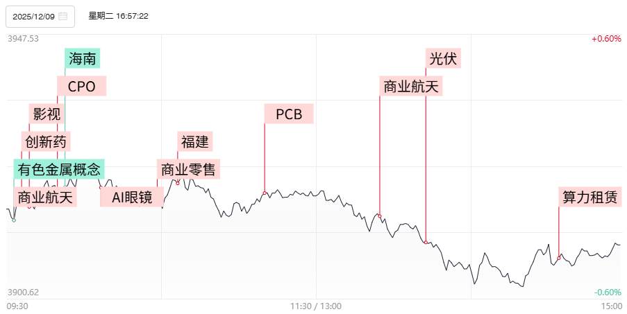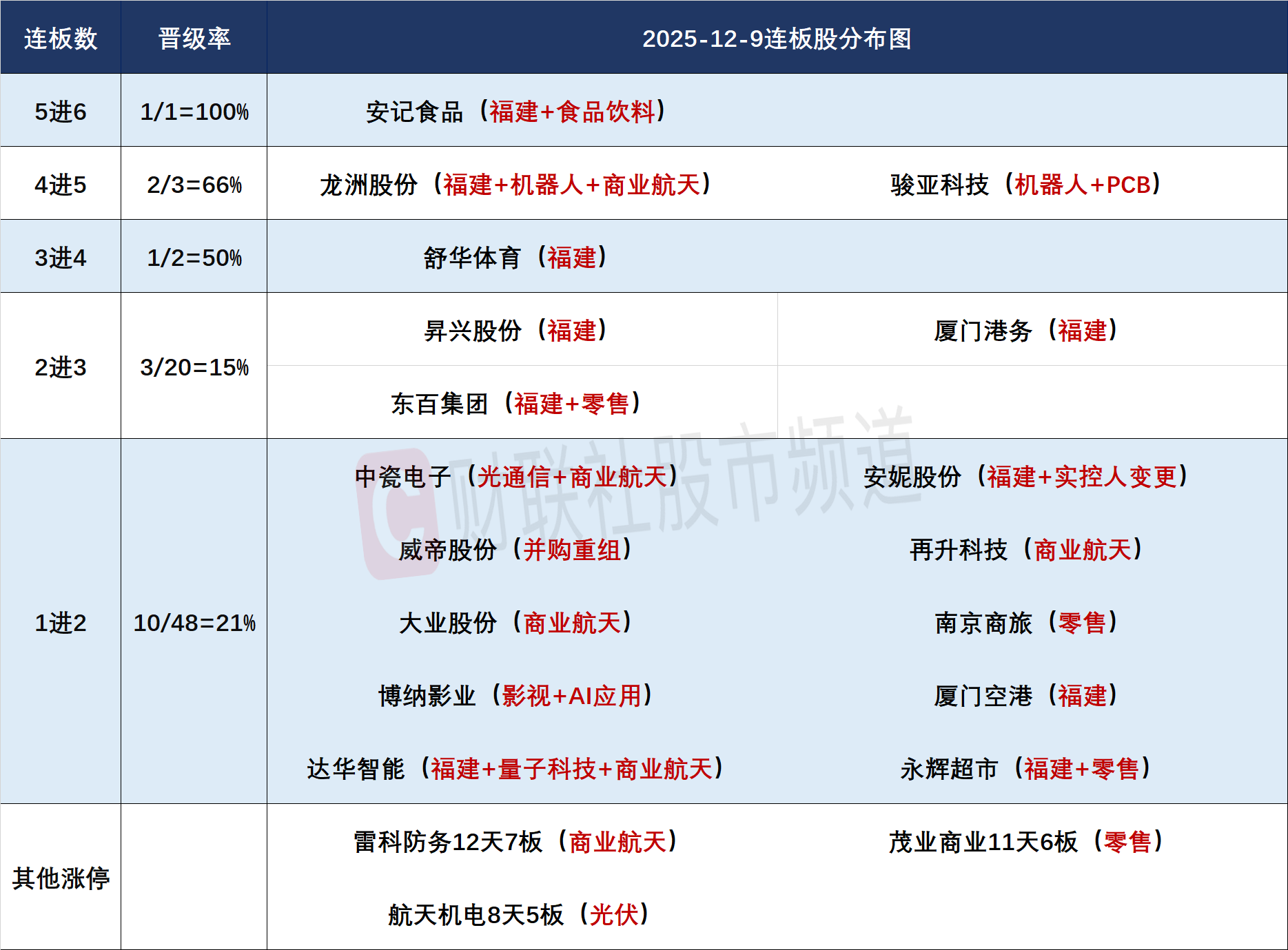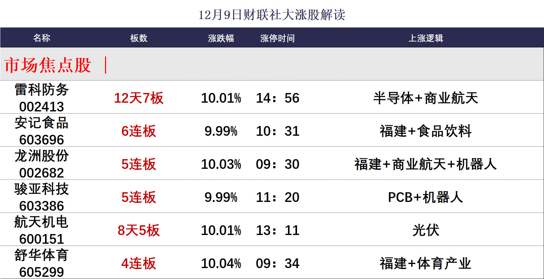 财联社12月9日讯,今日53股涨停,23股炸板,封板率为70%,安记食品6连板,龙洲股份、骏亚科技5连板,舒华体育4连板,厦门港务、东百集团、昇兴股份3连板,雷科防务12天7板,航天机电8天5板。三大指数涨跌不一,沪指、深成指震荡回落,创业板指冲高回落尾盘拉升。沪深两市成交额1.9万亿,较上一个交易日缩量1327亿。盘面上,全市场超4000只个股下跌。板块方面,算力硬件、零售、福建等板块涨幅居前,海南、有色金属、煤炭等板块跌幅居前。截至收盘,沪指跌0.37%,深成指跌0.39%,创业板指涨0.61%。