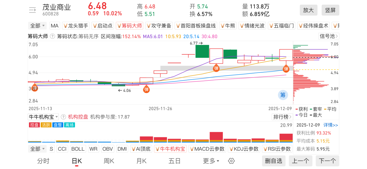 3)20251209-茂业商业-600828-【筹码大师】和【牛牛机构宝】-近期出现弹信号且底部量柱由绿转红