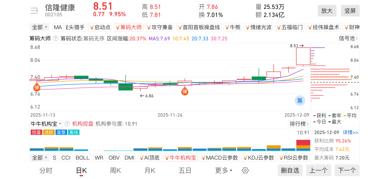 1)20251209-信隆健康-002105-【筹码大师】和【牛牛机构宝】-近期出现弹信号且底部量柱由绿转红