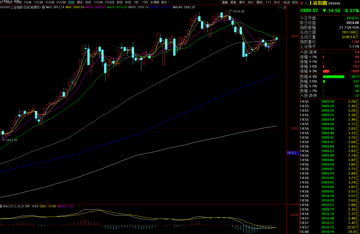 三大指数缩量震荡,其中沪指跌0.37%,深成指跌0.39%,创业板指涨0.61%。总体个股跌多涨少,下跌家数为4058家,涨停家数(排除ST)为53家,跌停家数(排除ST)为7家,市场情绪分化明显。两市成交额总计1.90万亿,较昨日缩量1327亿,成交量小幅缩减