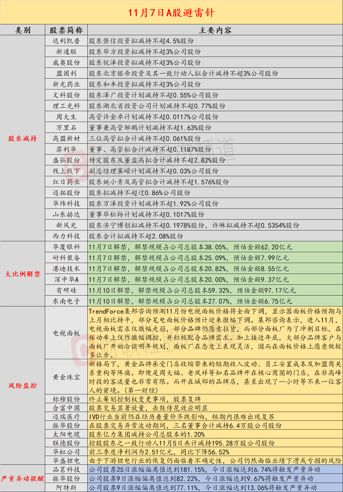 导读:财联社11月7日投资避雷针,近日,A股及海外市场潜在风险事件如下。国内经济信息方面包括:1)集邦咨询预测11月电视面板价格将全面下调;2)一小时等不来一位客人,黄金品牌承受阵痛;公司方面重点关注包括:1)标榜股份终止筹划控制权变更事项,股票复牌;2)8连板合富中国公告,股票交易显著放量,击鼓传花效应明显;海外市场重点关注包括:1)美股三大指数集体收跌,纳指跌近2%;2)美联储哈玛克表示,并不希望将利率下调至宽松区间。