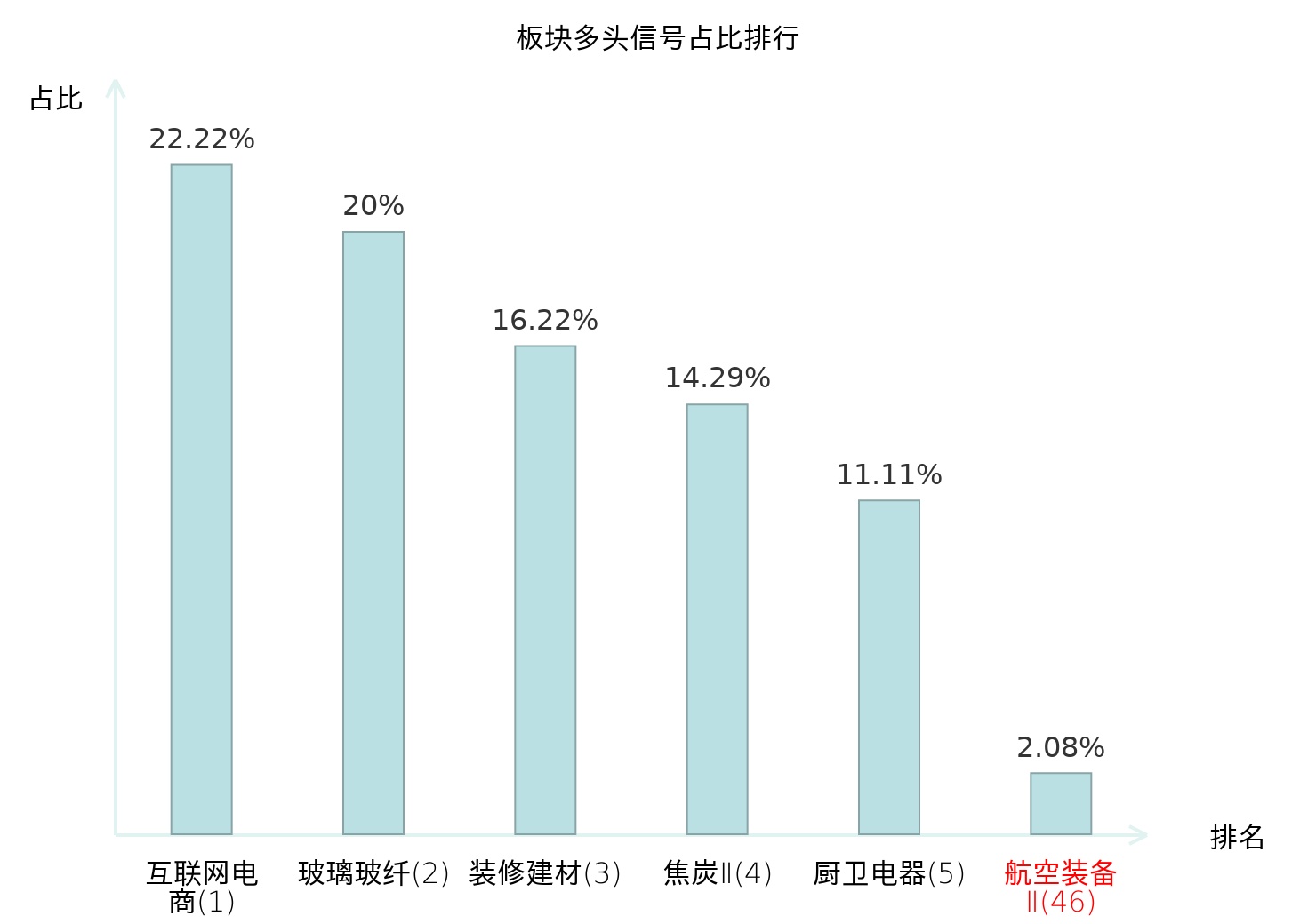 全市场所有行业板块中主力多头信号占比排名中,互联网电商板块位居第一。焦炭Ⅱ板块名次提升最快,较昨日上升118位。
