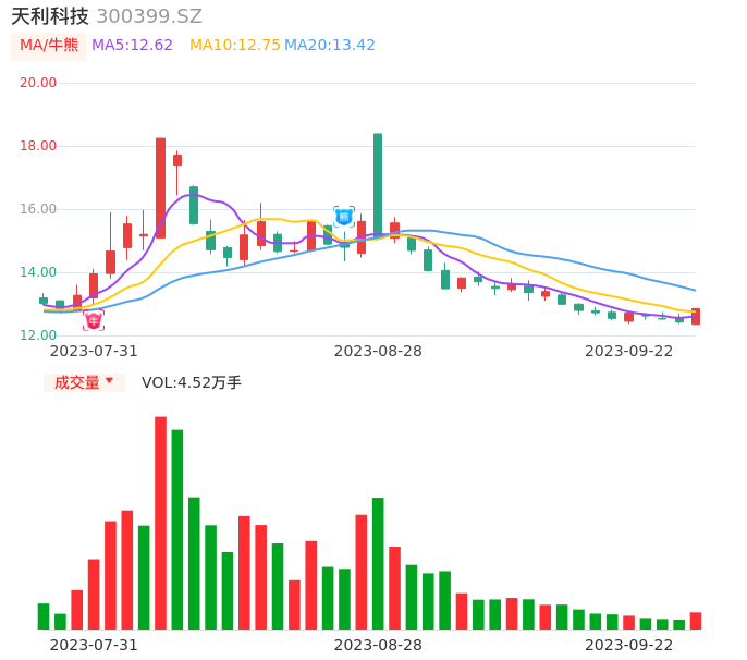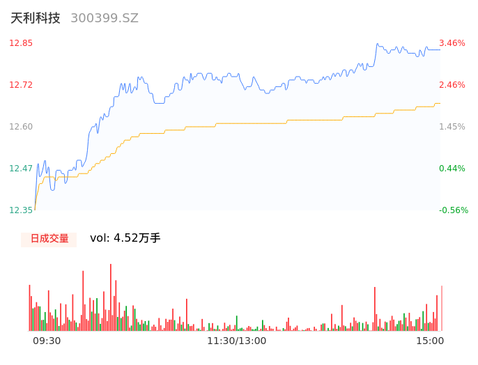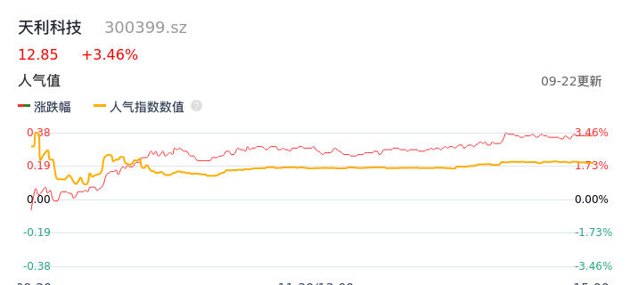 09月22日,天利科技收报12.85,股价涨幅3.46%,成交金额5724.64万元,换手率2.33%。
