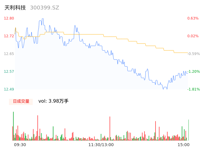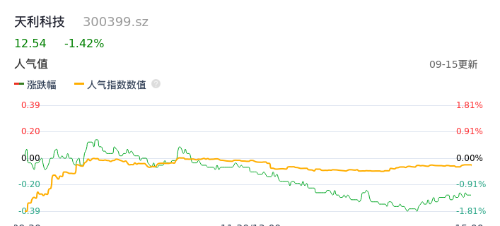 09月15日,天利科技收报12.54,股价涨幅-1.42%,成交金额5032.36万元,换手率2.06%。