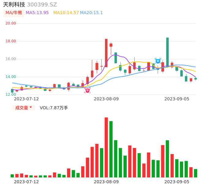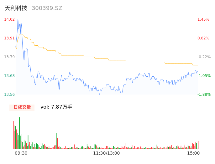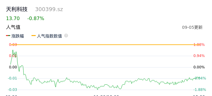 09月05日,天利科技收报13.70,股价涨幅-0.87%,成交金额1.08亿元,换手率4.07%。