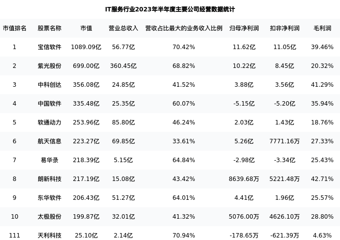 天利科技最新报告期数据为半年度,下表汇总了IT服务行业内市值靠前的公司半年度主要经营数据