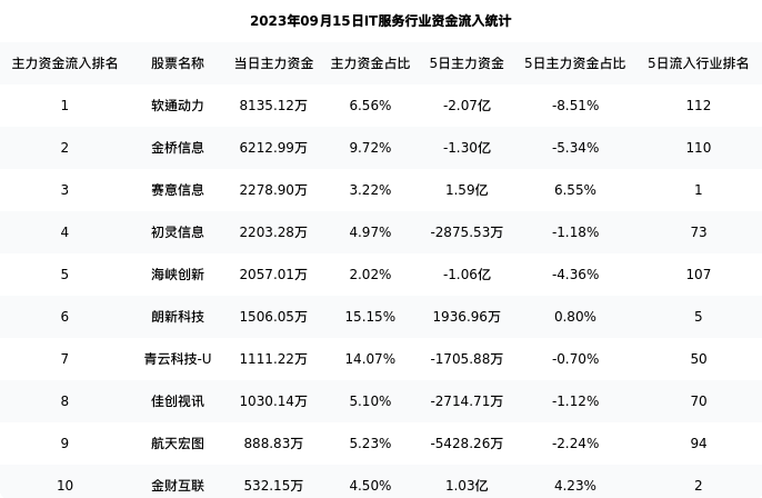 从主力资金流向来看,IT服务行业今日主力资金流入62.01亿元,在所有申万二级行业中排名:83/131。
