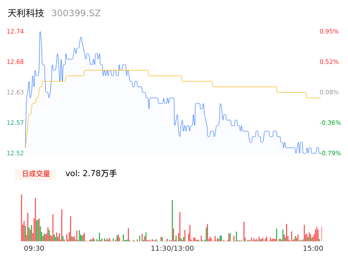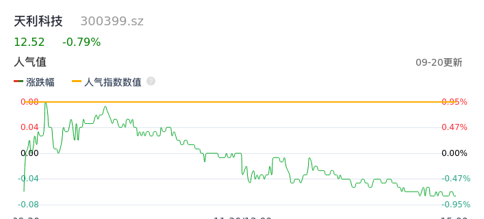 09月20日,天利科技收报12.52,股价涨幅-0.79%,成交金额3504.24万元,换手率1.43%。