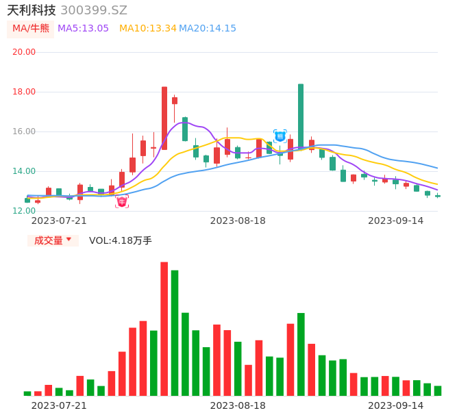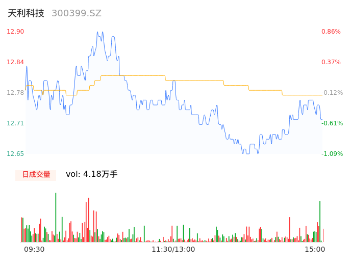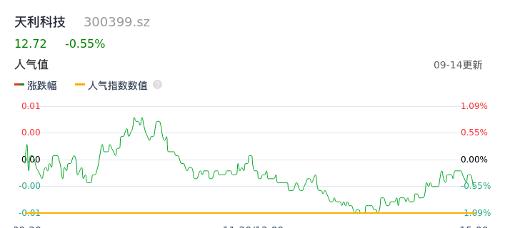 09月14日,天利科技收报12.72,股价涨幅-0.55%,成交金额5341.47万元,换手率2.16%。