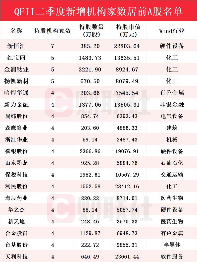 从最新持仓动向来看,wind数据显示,截至发稿,QFII二季度新进入270家个股的前十大流通股东名单。其中,新恒汇获QFII持股新增机构家数最多,达7家。此外,红宝丽、金浦钛业和扬帆新材新增QFII持股家数均达到5家。具体情况如下图: