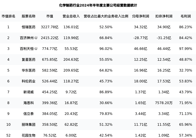 花园生物最新报告期数据为半年度,下表汇总了化学制药行业内市值靠前的公司半年度主要经营数据