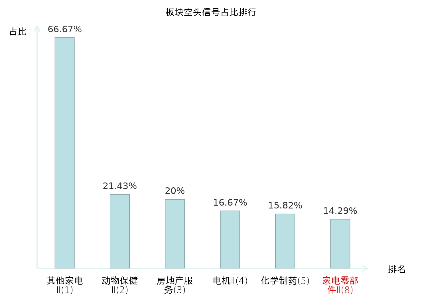 全市场所有行业板块中主力空头信号占比排名中,其他家电Ⅱ板块位居第一。家电零部件Ⅱ板块名次提升最快,较昨日上升110位。