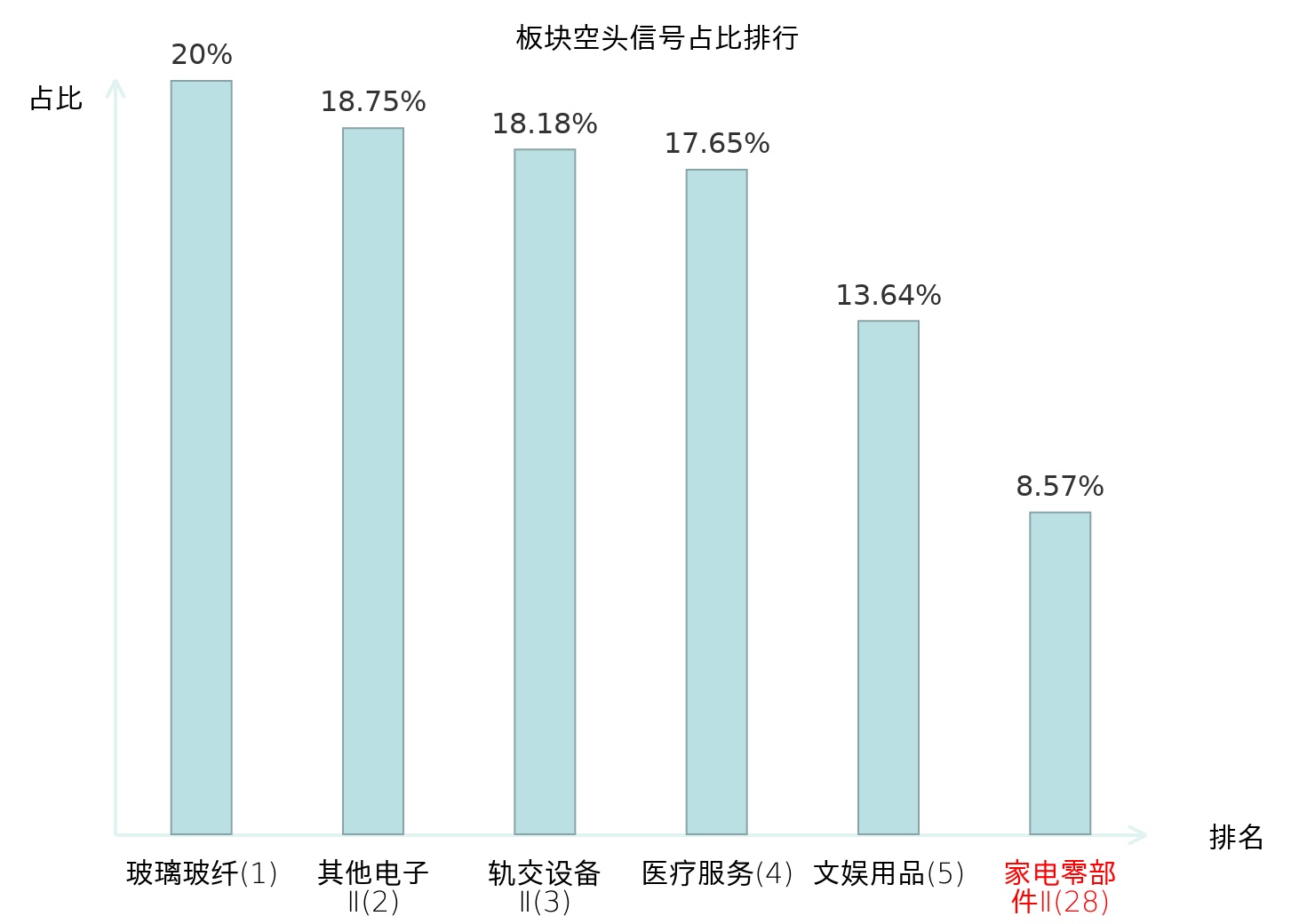 全市场所有行业板块中主力空头信号占比排名中,玻璃玻纤板块位居第一。医疗服务板块名次提升最快,较昨日上升126位。