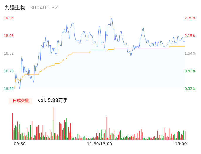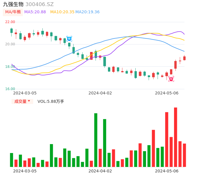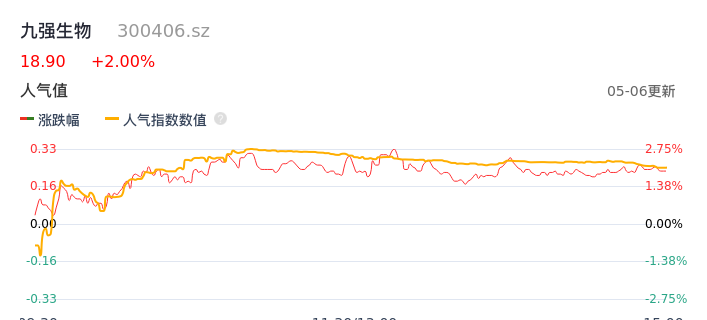 05月06日,九强生物收报18.90,股价涨幅2.00%,成交金额1.11亿元,换手率1.39%。