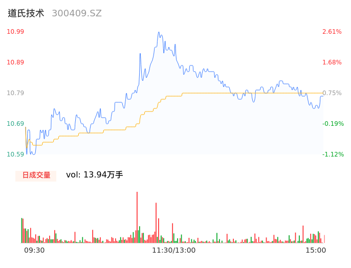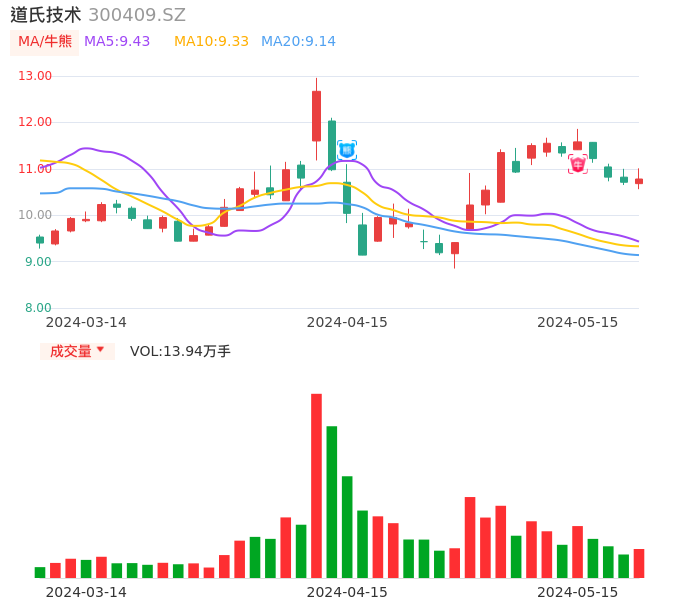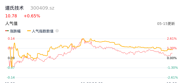 05月15日,道氏技术收报10.78,股价涨幅0.65%,成交金额1.50亿元,换手率2.86%。