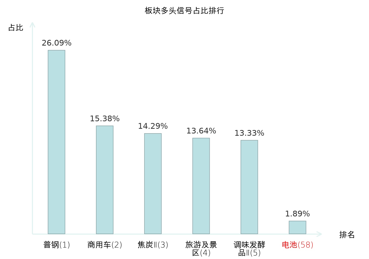 全市场所有行业板块中主力多头信号占比排名中,普钢板块位居第一。焦炭Ⅱ板块名次提升最快,较昨日上升119位。