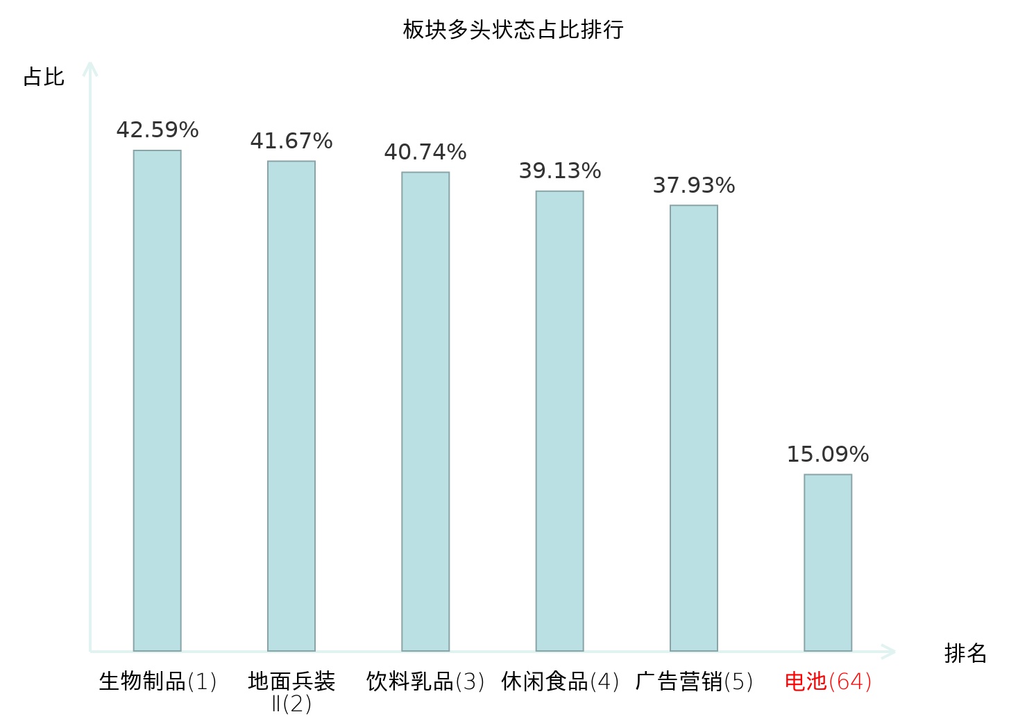 全市场所有行业板块中主力多头状态占比排名中,生物制品板块位居第一。黑色家电板块名次提升最快,较昨日上升65位。