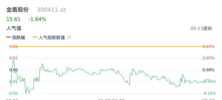 05月13日,金盾股份收报15.61,股价涨幅-1.64%,成交金额6.10亿元,换手率14.39%。