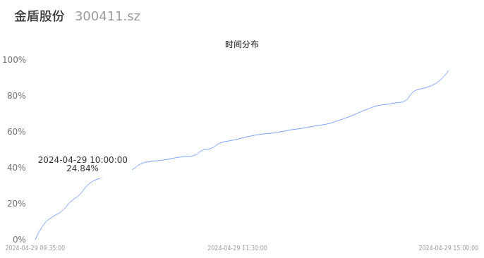 300411金盾股份2024年04月29日成交84.03万手,成交金额13.53亿元,相较昨日放量4.21万手,换手率31.10%,成交活跃。