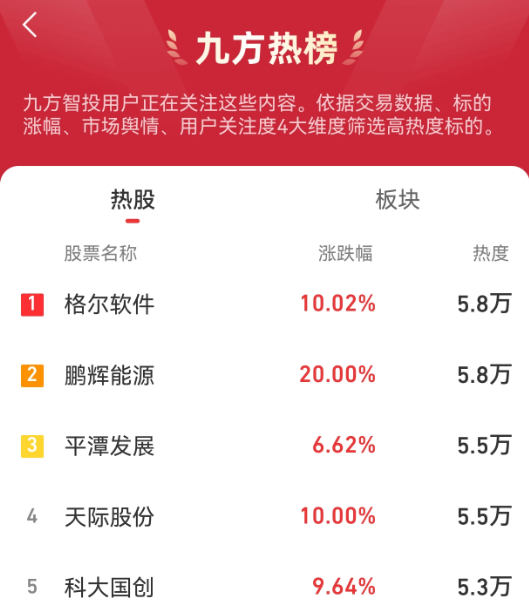 九方智投:格尔软件,鹏辉能源,平潭发展,天际股份,科大国创