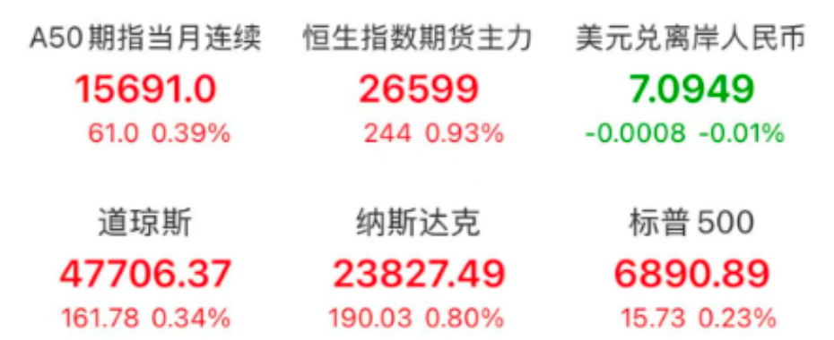 A50期指上涨0.39%,恒生指数期货主力上涨0.93%。