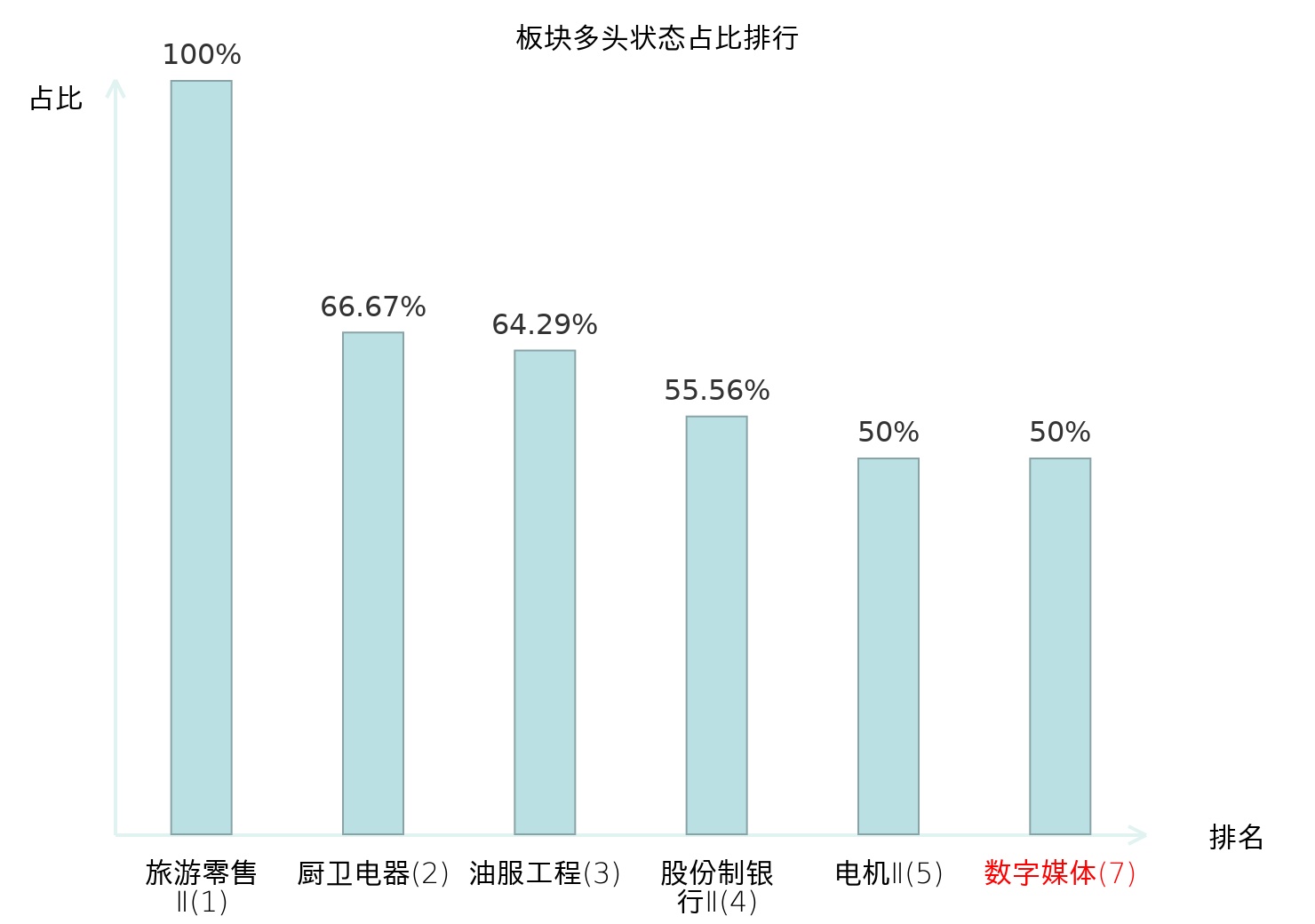 全市场所有行业板块中主力多头状态占比排名中,旅游零售Ⅱ板块位居第一。航海装备Ⅱ板块名次提升最快,较昨日上升78位。