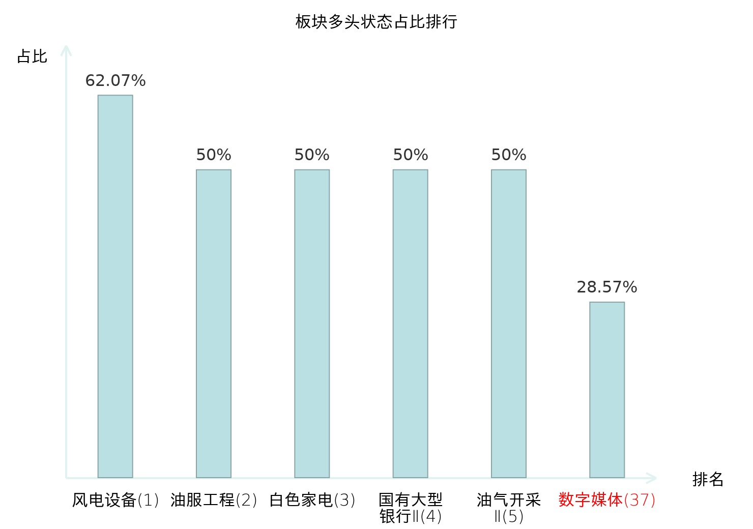 全市场所有行业板块中主力多头状态占比排名中,风电设备板块位居第一。动物保健Ⅱ板块名次提升最快,较昨日上升64位。
