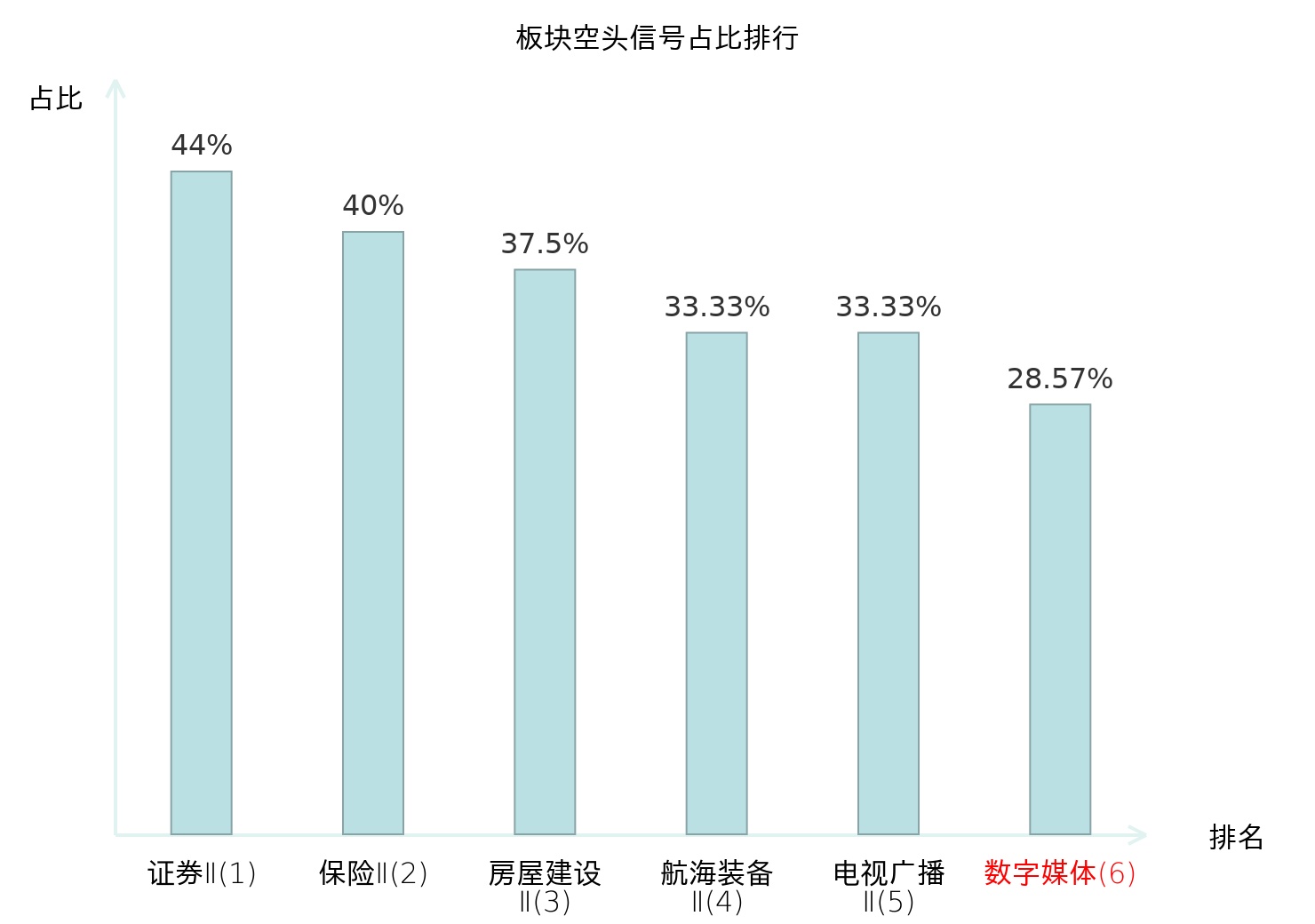 全市场所有行业板块中主力空头信号占比排名中,证券Ⅱ板块位居第一。证券Ⅱ板块名次提升最快,较昨日上升125位。