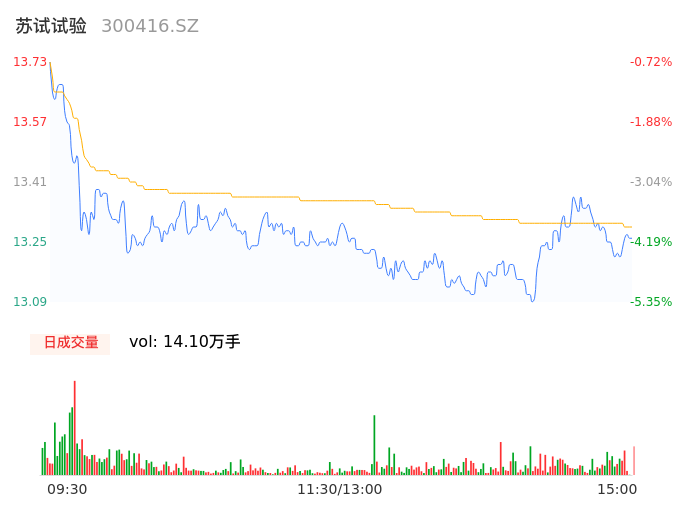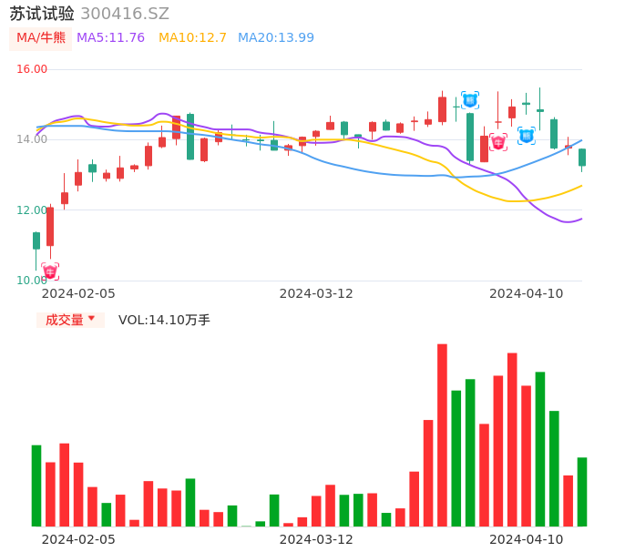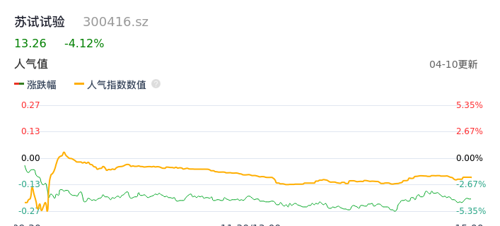 04月10日,苏试试验收报13.26,股价涨幅-4.12%,成交金额1.87亿元,换手率2.79%。