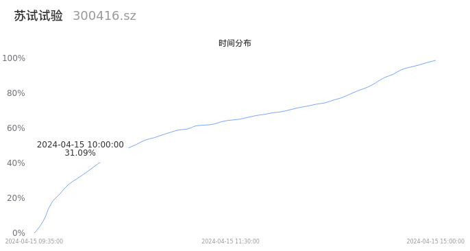 300416苏试试验2024年04月15日成交15.19万手,成交金额1.96亿元,相较昨日放量5.49万手,换手率3.01%,成交清淡。