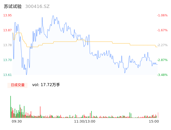 04月25日,苏试试验收报13.71,股价涨幅-2.77%,成交金额2.44亿元,换手率3.51%。