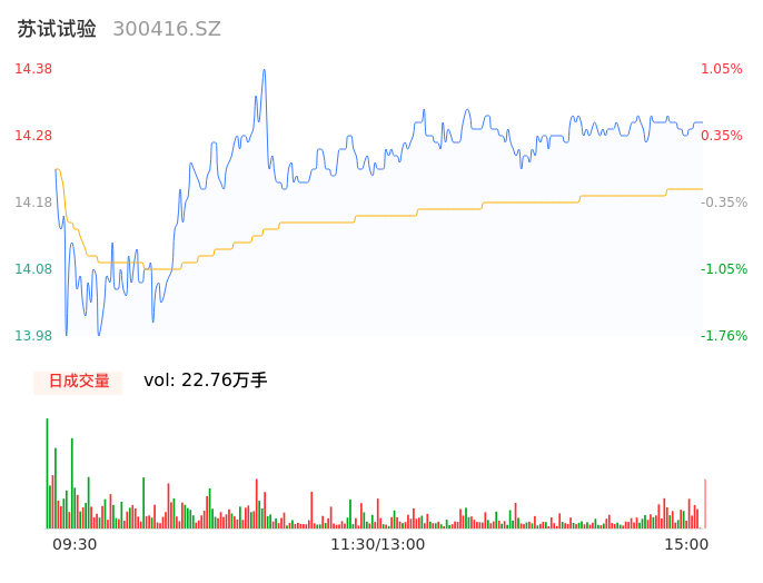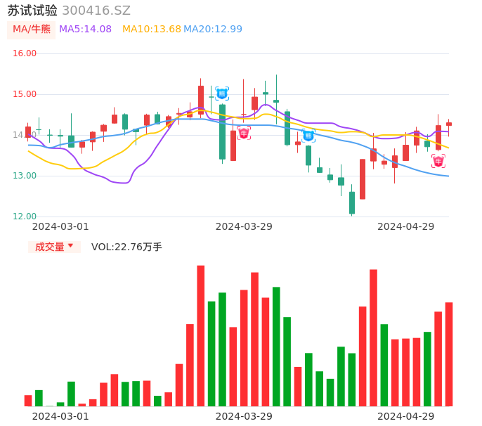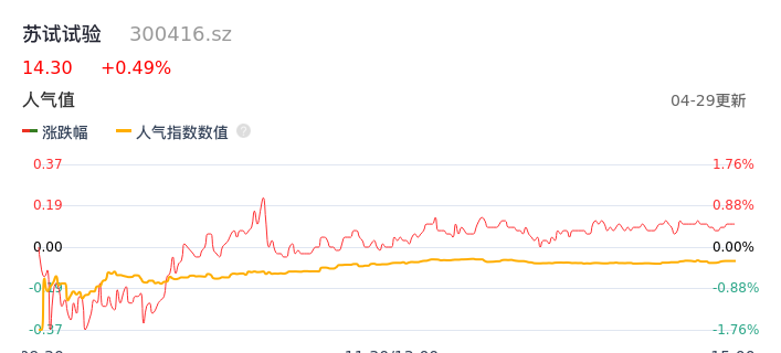 04月29日,苏试试验收报14.30,股价涨幅0.49%,成交金额3.23亿元,换手率4.51%。