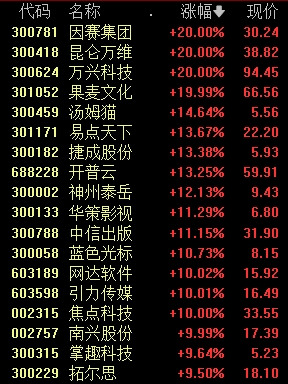 昆仑万维、万兴科技等多股涨停,汤姆猫、拓尔思等大涨。