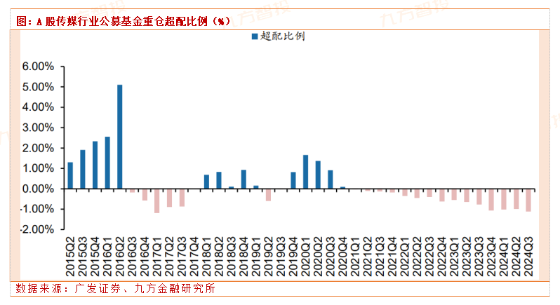 结构上看,游戏、广告营销、互联网行业、新闻出版发行、有线电视、教育行业的基金配置比例提升,符合资金持续对央国企、高股息等确定性资产的持续偏好,政策趋稳环境下游戏板块得到一定增配;影视制作、电影院线、体育、动漫遭调出,符合今年影视行业大盘遇冷行情。