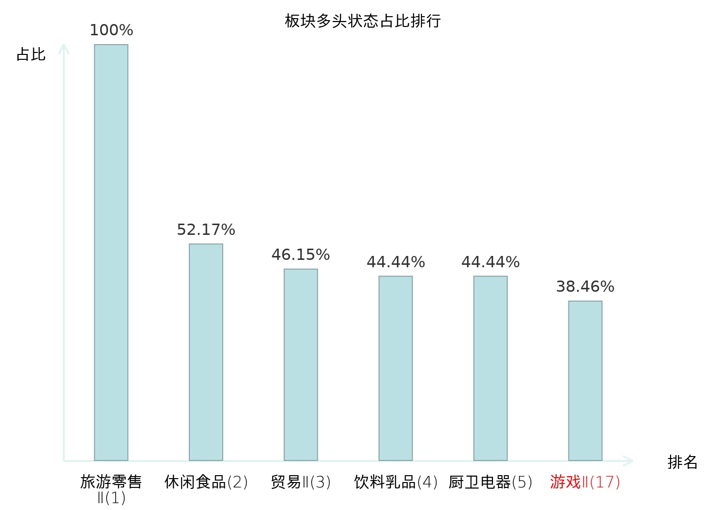 全市场所有行业板块中主力多头状态占比排名中,旅游零售Ⅱ板块位居第一。乘用车板块名次提升最快,较昨日上升91位。