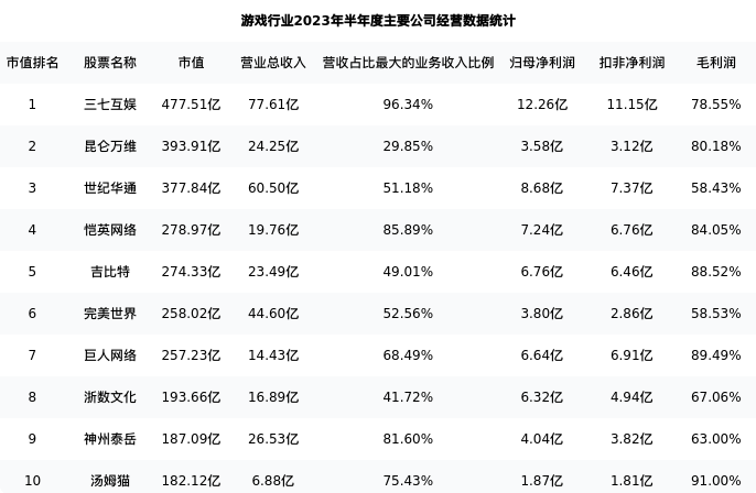 昆仑万维最新报告期数据为半年度,下表汇总了游戏行业内市值靠前的公司半年度主要经营数据