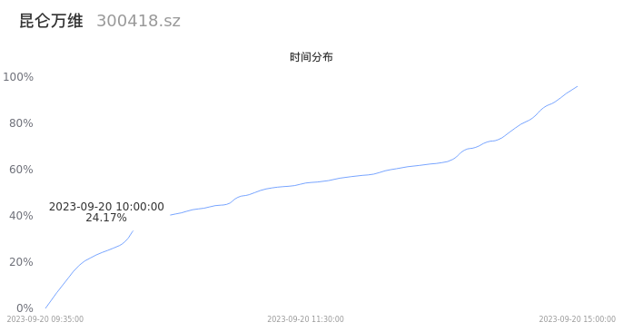 300418昆仑万维2023年09月20日成交30.81万手,成交金额9.42亿元,相较昨日缩量2.96万手,换手率2.78%,成交清淡。