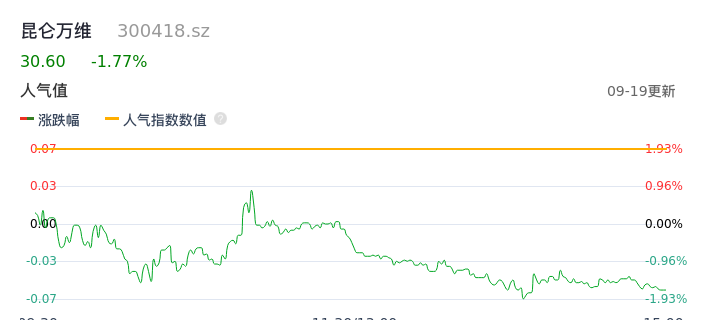 09月19日,昆仑万维收报30.60,股价涨幅-1.77%,成交金额10.44亿元,换手率3.05%。