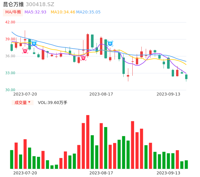 09月13日,昆仑万维收报31.95,股价涨幅-2.98%,成交金额12.68亿元,换手率3.58%。