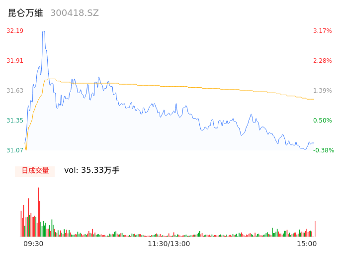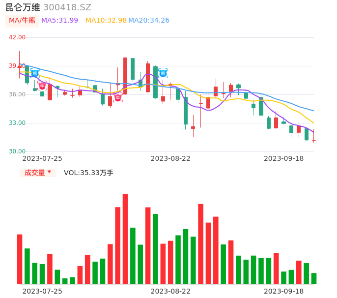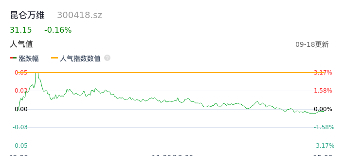 09月18日,昆仑万维收报31.15,股价涨幅-0.16%,成交金额11.14亿元,换手率3.19%。